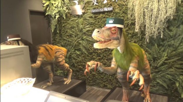 Imagina que entras en un hotel, y eres recibido en recepción por dos velociraptors con un gracioso gorrito que te hacen reverencias, y te preguntan qué tipo de habitación quieres. Parece una película de David Lynch, pero es una día como otro cualquiera en el Hotel Henn-na de Japón, atendido únicamente por extraños robots.
