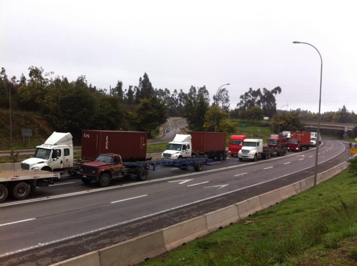 A la altura de la pasarela de Placilla, próximo al acceso a Valparaíso por la Ruta 68, 140 camiones y 50 tolvas bloquean 2 de las 4 vías de la carretera, en una manifestación de “advertencia” en contra de la Empresa Portuaria de Valparaíso (EPV) y el alcalde Jorge Sharp.