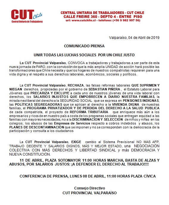 Con una movilización para este jueves 11 de abril, la central Unitaria de Trabajadores en Valparaíso realizará la segunda paralización activa a nivel nacional durante el gobierno del presidente Sebastián Piñera.