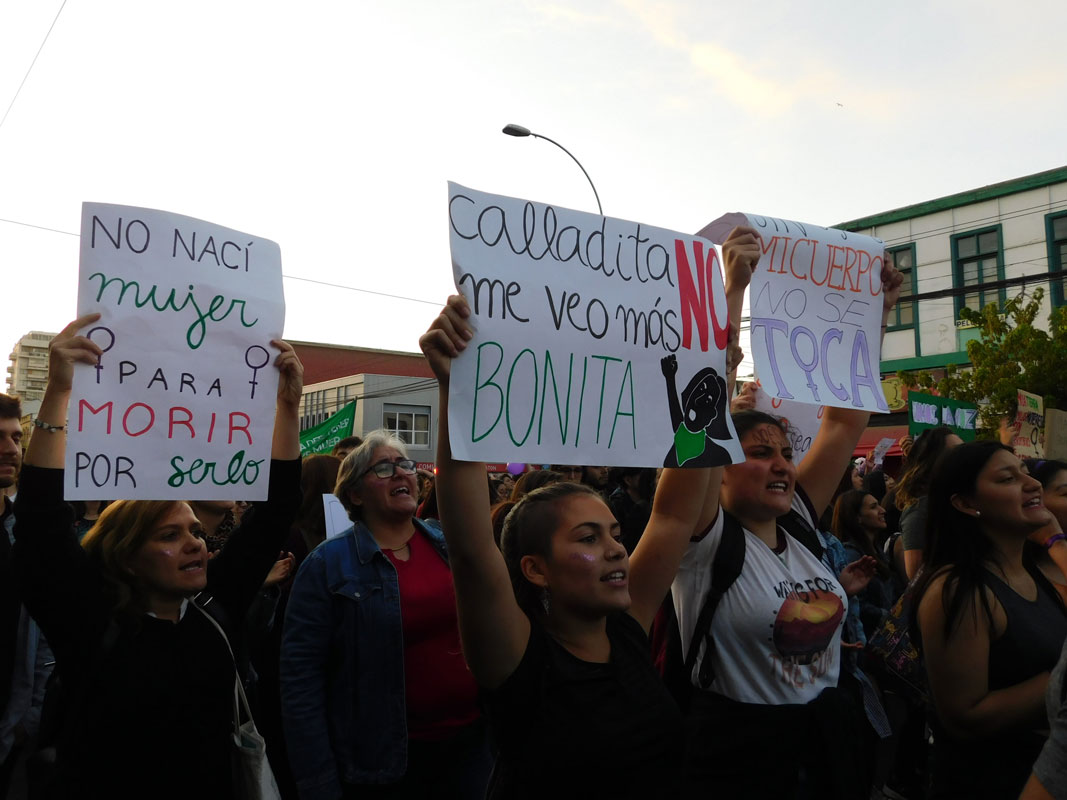 Este 8 de Marzo de 2019, llevamos 66 días desde comenzado el año y hasta la fecha y ya hay 11 casos de femicidios a lo largo de Chile. Frente a esta situación, que desgraciadamente no logran disminuir, mujeres de cada rincón de esta angosta y larga franja de tierra salieron a la calle a luchar, conmemorar y relevar sus derechos, con el objetivo que el acoso callejero disminuya cada día más, y que las mujeres puedan salir a la calle tranquila sin el miedo de pensar en si volverá o no a su hogar, además de hacer un llamado a las autoridades con respecto al maltrato físico y psicológico de muchas esposas, compañeras, novias, etc.