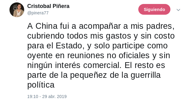 [LA MENTIRA DE CRISTÓBAL PIÑERA] El 29 de abril, Cristóbal Piñera señalaba a los medio, “cansado” del asedio de los periodistas que: “a China fui a acompañar a mis padres cubriendo todos mis gastos y sin costo para el Estado”. https://t.co/nv1W7dThZw