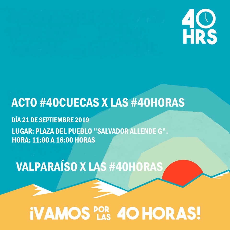 Como una manera de colaborar con la discusión que se ha generado en el país por el proyecto de ley que quiere rebajar las horas semanales de trabajo de 45 a 40 horas, la directiva de la CUT de Vaparaíso ha querido organizar un acto denominado 40 cuecas por las 40 horas, el cual se desarrollará este Sábado 21 de Septiembre desde las 11 de la mañana en el Parque Italia, más conocido como Plaza del Pueblo, en Valparaíso.