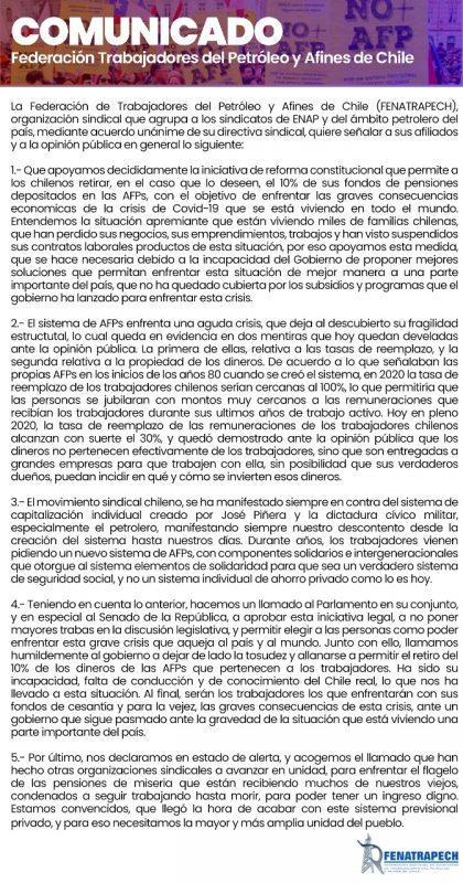 Dirigentes de la Federación de Trabajadores del Petróleo Fenatrapech, que reúne a los sindicatos de ENAP y del ámbito petrolero del país, manifestaron su apoyo al proyecto de ley que permite retirar el 10% de los fondos de pensiones para enfrentar la pandemia.