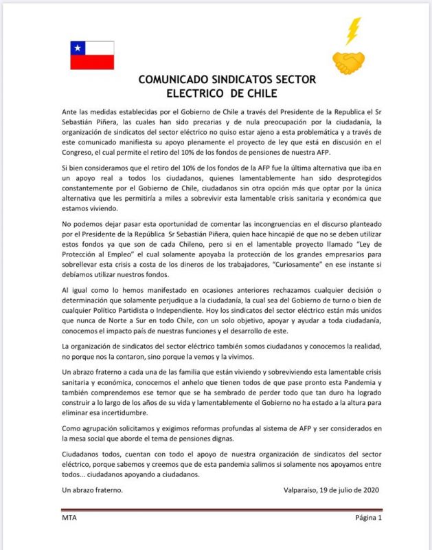 Trabajadores asociados al Sindicato, Federación y Confederación participantes y adherentes al comunicado rubro de Generación, Distribución, Transmisión y Prestadores del Servicio del sector eléctrico del país, califican de “precarias y nulas” las medidas adoptadas por el Presidente Sebastian Piñera, para ir en ayuda especialmente de la clase media del país.