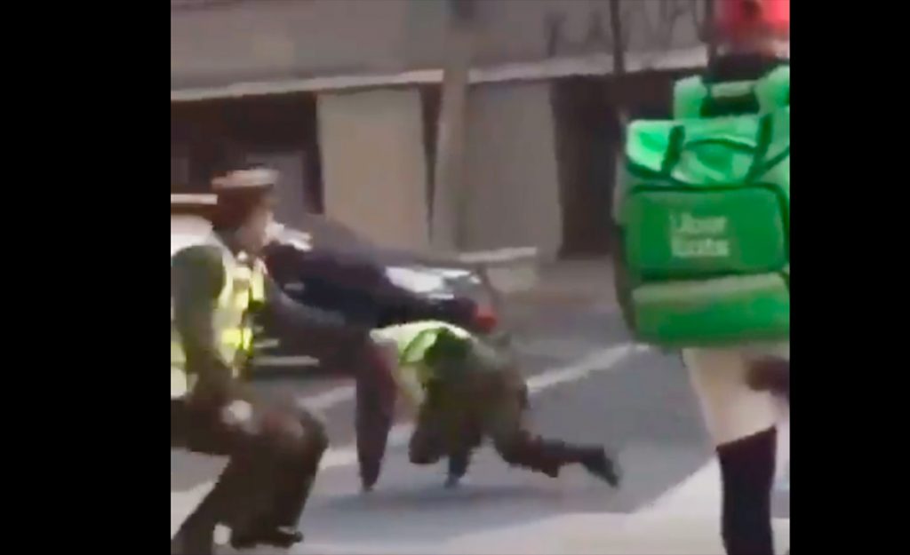 En ese momento, y ante la vista de muchos testigos que sacaron su celular, empezó a bailar y saltar sobre el vehículo, para luego arrancar con enganches y fintas que hicieron que ambos carabineros cayeram estrepitosamente al suelo.