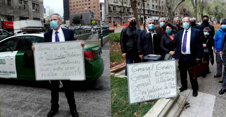 “Les comunicamos al consejo de administración que si ellos no presentan una demanda para recuperar los dineros percibidos en contra de la ley por parte de los generales [Eduardo] Gordon, [Gustavo] González, [Bruno] Villalobos y [Mario] Rozas, nosotros daremos cuenta de que ellos como uniformados se negaron a hacerlo a pesar de que por ley tienen la obligación de dar cuenta a tribunales de justicia del enriquecimiento ilícito de esos cuatro generales directores”, señala Jorge Hernández, uniformado en retiro y participante de la manifestación.