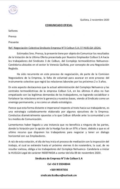 Mediante un comunicado, la directiva del sindicato Nº3 de Colbún, con sede en Quillota, acusó la falta de diálogo por parte de la empresa para avanzar en el proceso de negociación colectiva.