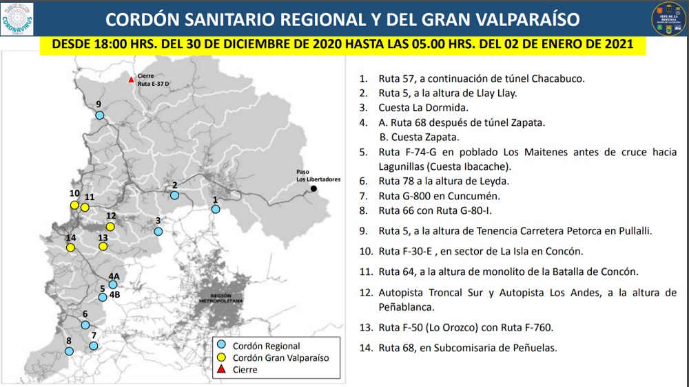 Desde este miércoles 30 de diciembre a las 18:00 de la tarde hasta el sábado 2 de enero a las 05:00 de la mañana, habrán cordones sanitarios en diferentes puntos de la región.