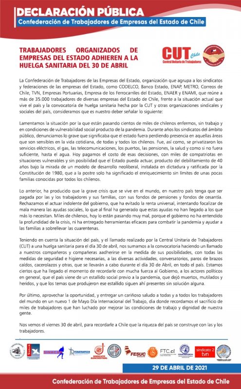 Los sindicatos y federaciones de Codelco, Banco Estado, Enap, Metro, Correos de Chile, TVN, Empresas Portuarias, Empresa de los Ferrocarriles del Estado, ENAER y ENAMI han hecho un llamado a plegarse a las actividades convocadas a propósito de la huelga sanitaria convocada por la CUT para este 30 de abril. Empresas estatales adheridas reúnen a más de 35.000 trabajadoras y trabajadores.
