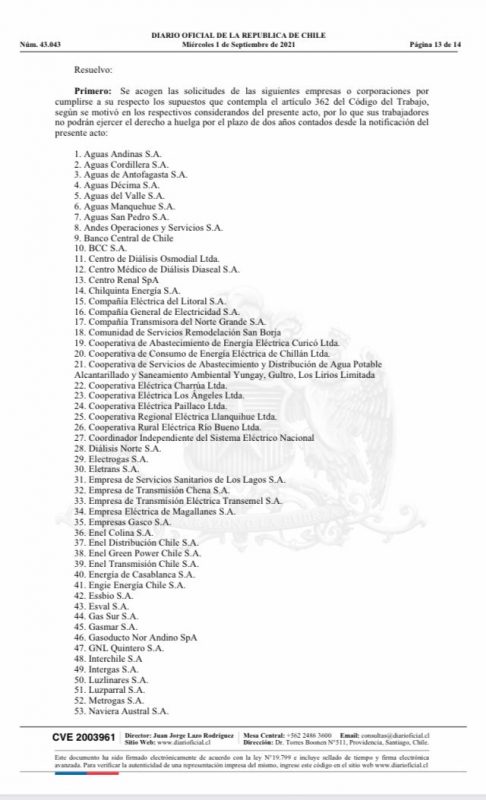 Mediante una publicación en el Diario Oficial de hoy, el gobierno dió a conocer el listado final de empresas cuyos trabajadores tienen prohibido el ejercicio del derecho a huelga establecido en el artículo 362 del Código del Trabajo.