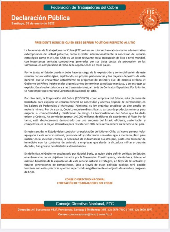 Mediante un comunicado, el Presidente de la Federación de Sindicatos Patricio Elgueta y el Consejo Directivo Nacional de la FTC, marcó posición frente al debate del litio y manifestaron su rechazo a la licitación internacional que lleva a delante este gobierno.