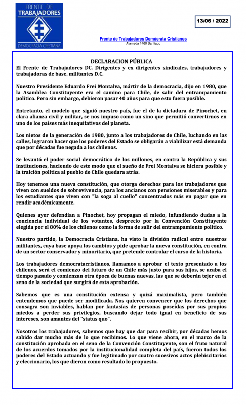En una declaración pública, el Frente de Trabajadores DC, dirigentes y ex dirigentes sindicales, trabajadores y trabajadoras de base y militantes llaman a aprobar el texto de la nueva constitución presentado a los chilenos. “Será el comienzo del futuro de un Chile más justo para sus hijos…”