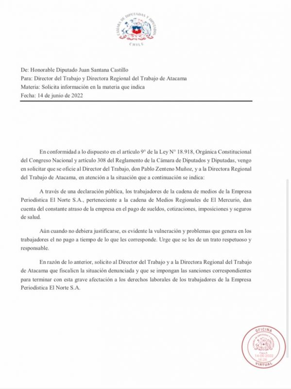 Mediante oficio el Diputado PS por la Región de Atacama pidió oficiar a la Dirección del Trabajo debido a la denuncia dada conocer de los trabajadores de la Empresa Periodistica El Norte S.A perteneciente a la cadena de medios regionales de El Mercurio de sueldos, cotizaciones, imposiciones y seguros de salud impagos por parte de la empresa a sus trabajadores.