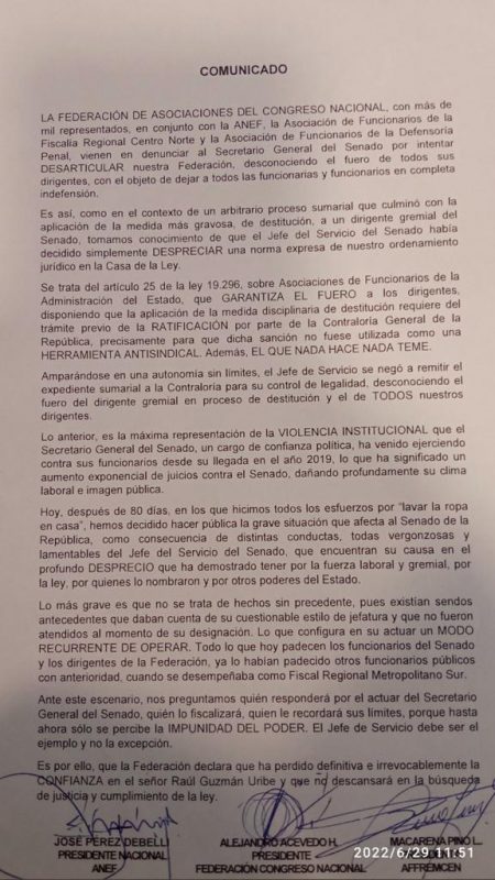 El Jueves 29 de Junio se realizó una conferencia de prensa de varias organizaciones de trabajadores en apoyo a la Federación de Asociaciones del Congreso Nacional, orgánica que agrupa a Asociaciones de Funcionarios de ambas cámaras del parlamento (Diputados y Diputadas y Senado), representando a alrededor de mil funcionarios, en su denuncia respecto a numerosos episodios de acoso y prácticas antisindicales realizadas por quien es, en rigor, el jefe de Servicio en este poder el Estado: El Secretario del Senado y ex Fiscal del Ministerio Público, Raúl Guzmán.